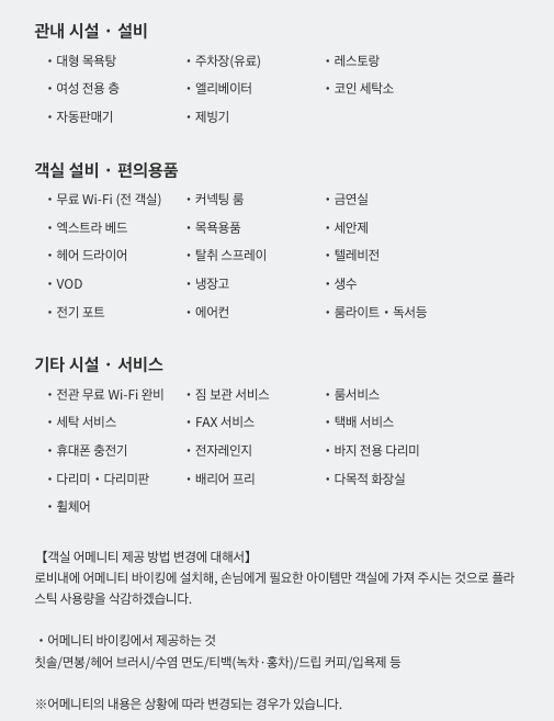 체크인시 안내데스크에서 DHC 세안제품과 로션을 주고 로비에 일회용 어메니티가 있으니 필요한 것들을 가져가실 수 있어요.